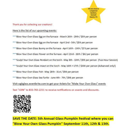 Blow Your Own Glass Pumpkin at the 4th annual Glass Pumpkin Festival. Ages 12+ Get on our email list by sending us your email - wgkglass@aol.com Subscribe to receive text messages by texting the word "JOIN" to 833-765-2211