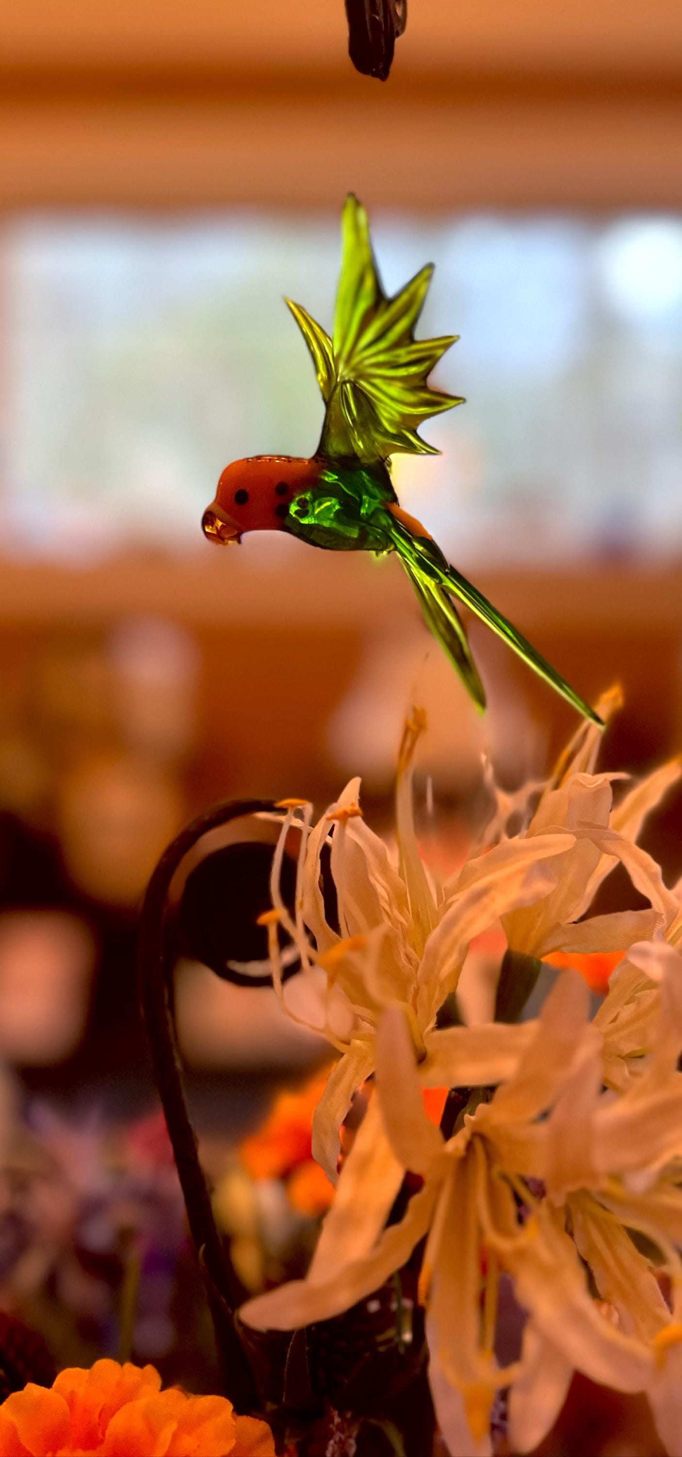 Size: 3x4 inchesColor: GreenHandmade, lamp worked glass Budgerigar ornament.